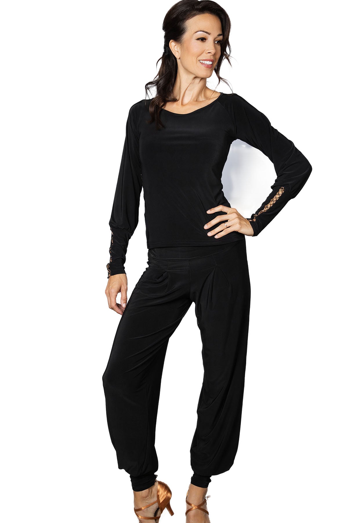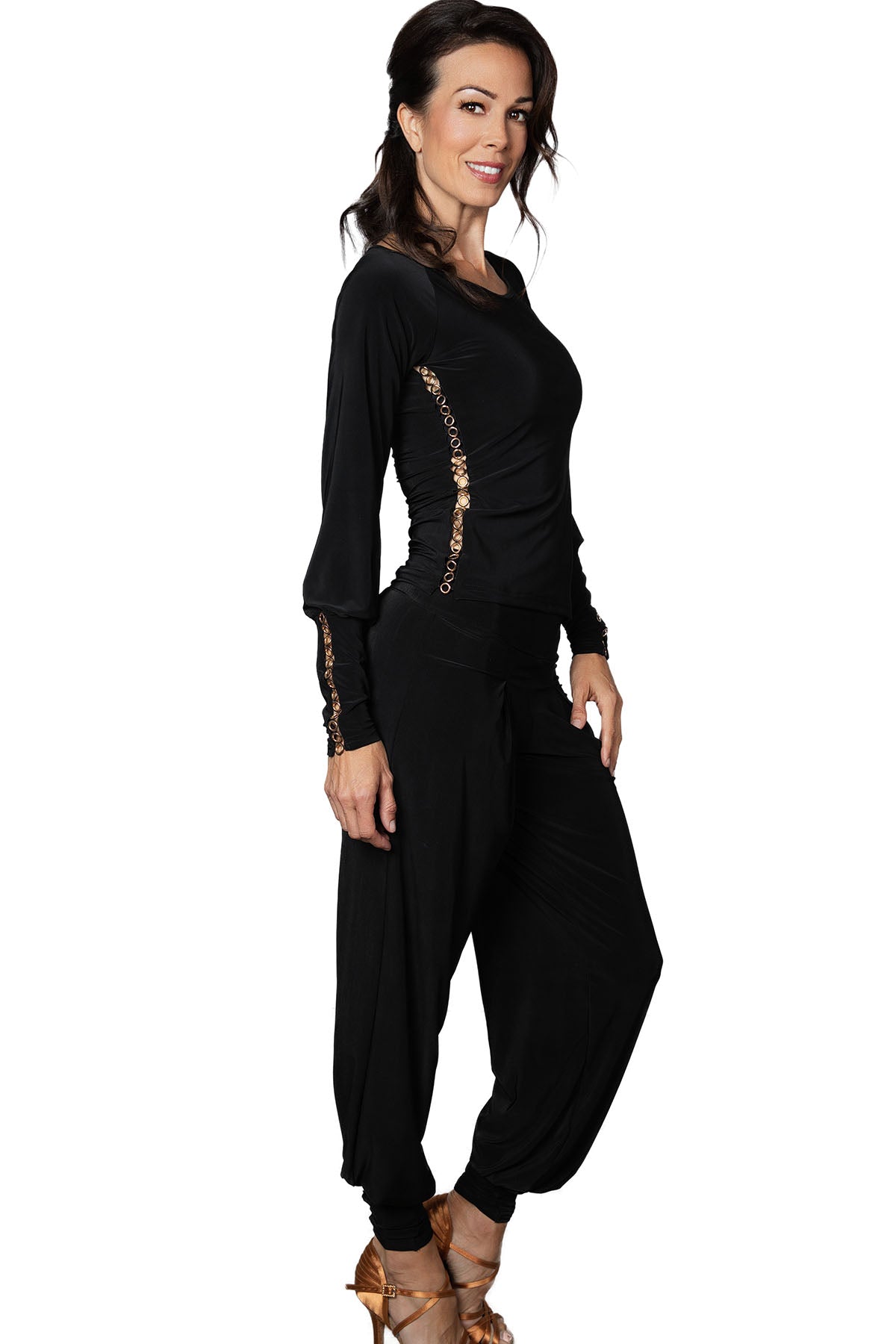 Effortlessly elevate your ballroom wardrobe with our P2402 Circle Embellished Harem Pants. The wider cut and ankle cuff, adorned with a golden grommet trim, create a playful and stylish look. Perfect for those who want to make a statement on the dance floor.